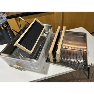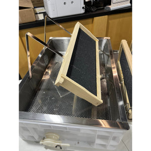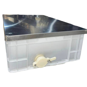 Uncap your frames at home like a pro. Durable plastic tub has a honey gate valve for easier bottling. Stainless steel strainer insert helps to strain beeswax and other impurities out of the honey. Comes with two stainless steel racks...one that attaches to the inside of strainer insert to hold your frame steady as you uncap it, and one that will hold your frames before and after their visit to the uncapping tub...the stainless steel lid, when overturned also becomes a drip tray. Simple elegant design that doesn't take up a lot of space...perfect for the hobbyist beekeeper! 24" x 16" x 7"