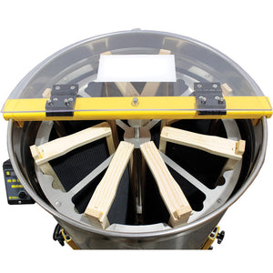 We're turning honey extracting "upside down" with this updated machine! Instead of mounting the motor and drive system up on top, we've moved it down underneath. This design brings major benefits: lower center of gravity for BETTER BALANCE, way easier loading/unloading of frames thanks to wider lids and a narrower top bar, and a cleaner overall look.