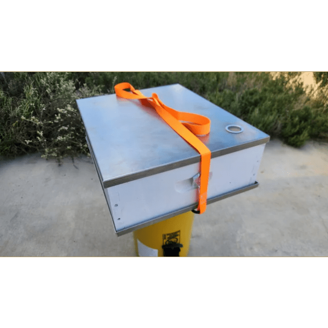 This hive adapter goes from the bucket to a 10 frame Langstroth deep or medium hive bodies with frames (frames with drawn out comb are best). It allows the bees to climb upwards out of the vacuum bucket and right onto the frames of the box. Add a frame feeder, and you can leave the bees locked in for a couple of days to reduce absconding. When ready, move the box with the bees, frame, and feeder into their new hive. Easy peasy lemon squeezy!!!