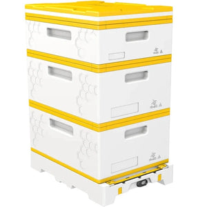 The Three Story HiveIQ Beehive Kit includes all of the components required to create a three story beehive, except for frames, foundation, and glue. (Frames are sold separately. Each deep box will hold 9 standard deep Langstroth frames; each medium box will hold 9 standard medium Langstroth frames.) This kit is supplied flat packed (unassembled) and includes:
