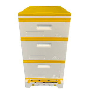 The HIVEIQ base is molded with high density EPS for high strength and reduced weight for ease of moving when necessary. The ventilated hive floor is a perforated powder coated aluminum for optimal hive ventilation, improved hive hygiene, and pest protection. The three-stage hive entrance enables the entrance to be opened and closed in one-third increments depending on the colony's strength and conditions. Hive entrance locks on each end locks the entrance in the closed or open position. Grooves on the underside of the base allow a for thin corrugated cardboard or melamine board (not included) to be inserted into the bottom to reduce ventilation if needed. RFID/NFC Tag is standard with every hive--the tag allows you to quickly scan and view the dashboard of each hive in the HIVEIQ software.