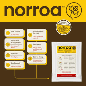 Norroa™ targets a specific protein in varroa mites that ultimately stops their reproduction. No negative impact on colony health or brood production were observed in field trials. Studies have shown no negative impact to larvae, adult bees, or queen, supporting a healthy and productive hive. Norroa™ works to maintain mite levels at the time of application. For best results, apply Norroa™ any time that mite levels are low and honey supers are not on the hive.