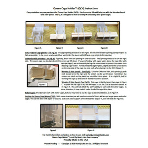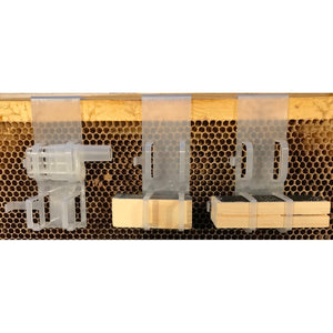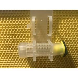 Take the guesswork out of hanging your queen! Sick of those annoying metal tabs that break or the cage falls down into bottom of the hive? This holder accommodates all of the common queen cages...even hair roller cages for cell introduction. Just hang your queen's cage on a nice middle frame of brood. Re-useable! Greatest thing since sliced bread. Recommended for new beekeepers getting package bees. Plastic. Queen cages not included. Made in the USA.